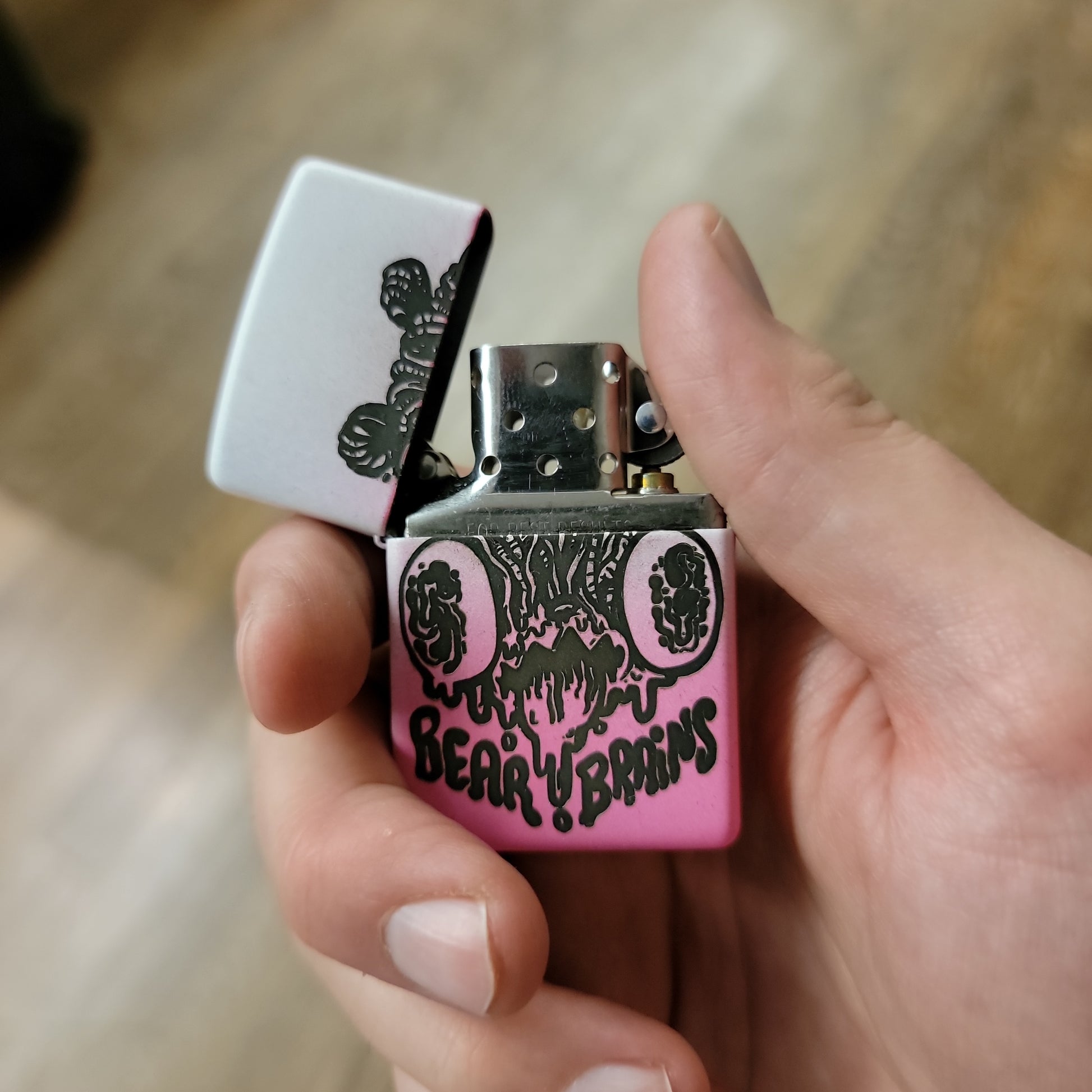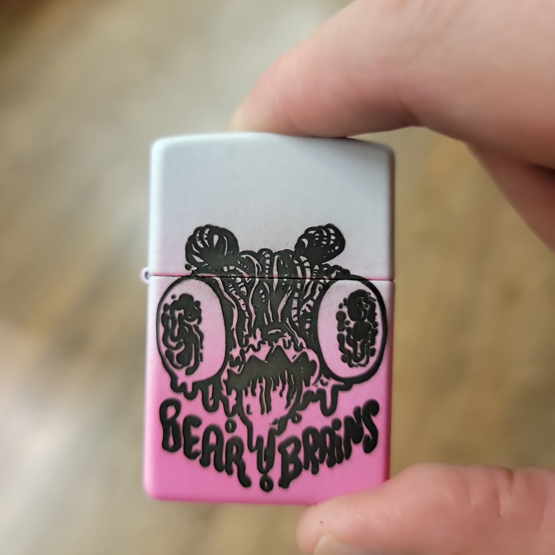 Laser etched with BEARBRAINS insignia with white and pink ombre coating.