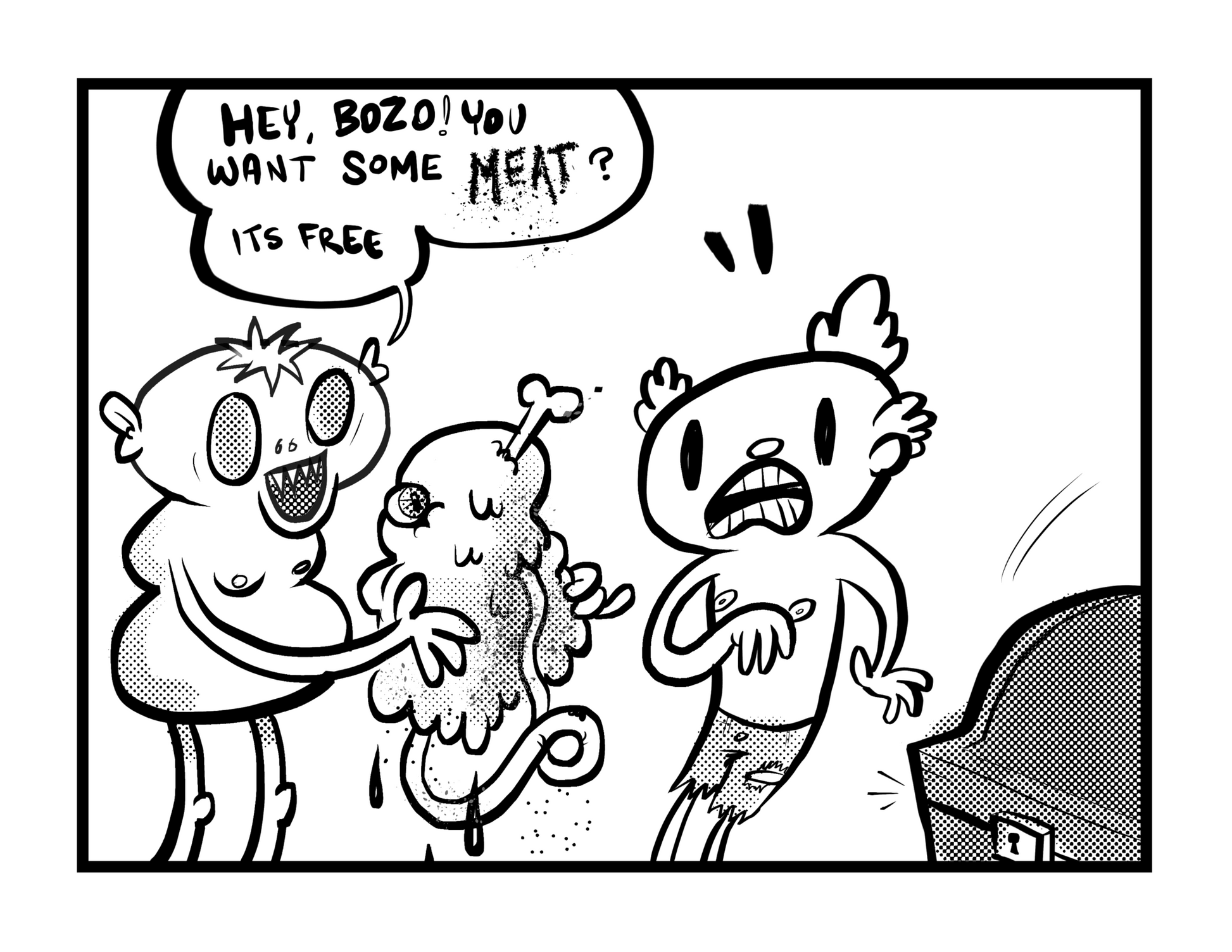 What does it REALLY mean to eat meat. Find out inthei stinky mini zine by Nate Bear.